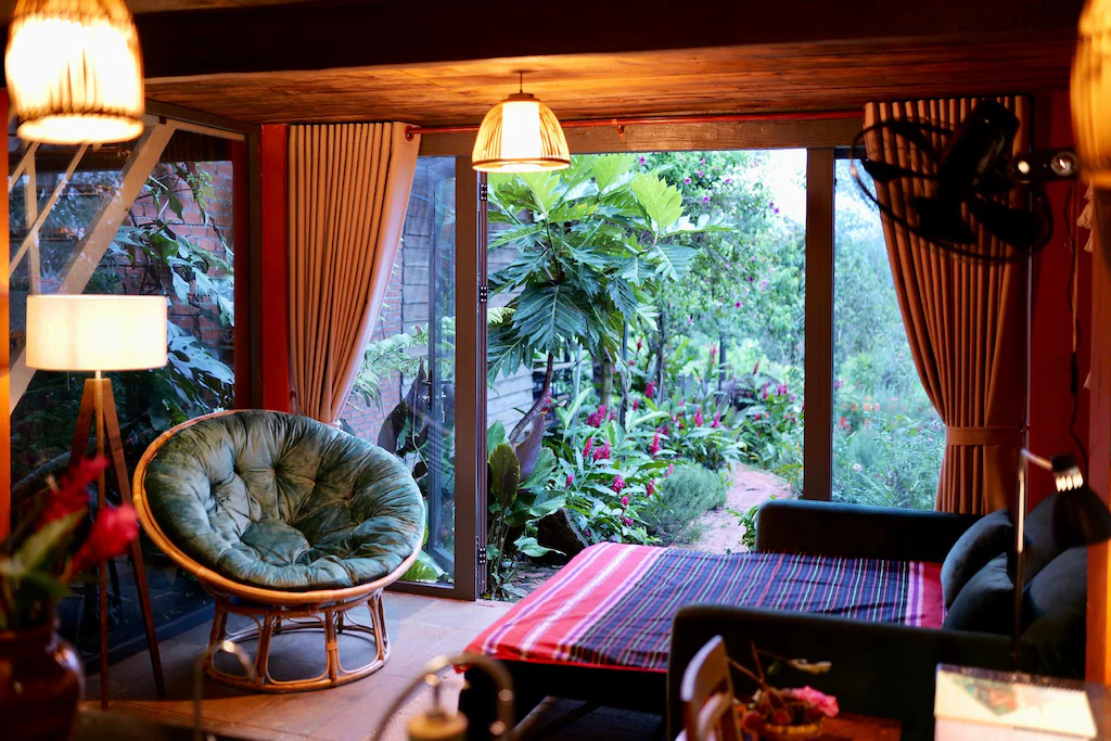 Điều mình thích nhất là cửa sổ lớn nhìn ra vườn. Buổi sáng thức dậy, chỉ cần kéo rèm ra là thấy màu xanh phủ kín. Cảm giác đó khác hẳn khi ngủ trong khách sạn thành phố – nơi mà mở mắt ra thường chỉ thấy bê tông.